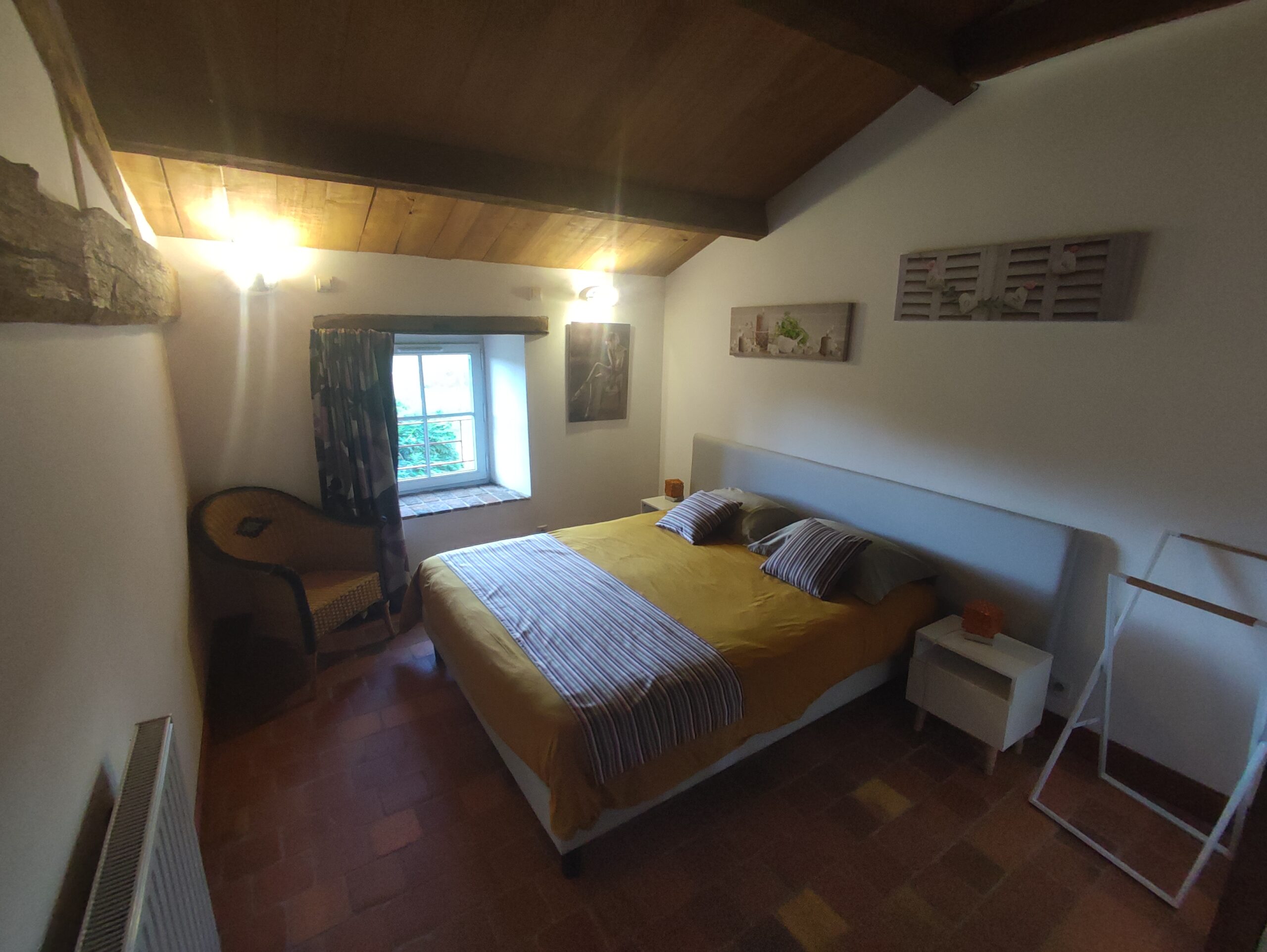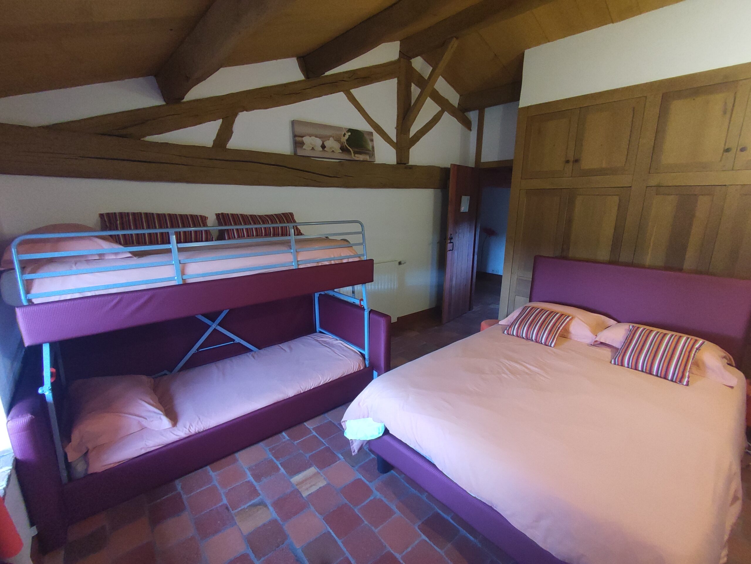 À l’étage, deux chambres accueillent les familles : l’une avec un lit double de 160 cm, l’autre avec un lit de 140 cm et une mezzanine comprenant deux couchages en 90 cm. Une salle d’eau avec une grande douche et des toilettes est également à disposition.